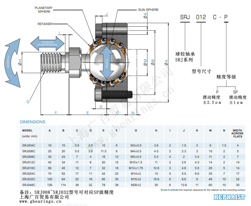 SRJ016C-SP 日本HEPHAIST球鉸軸承 運用在超精密平臺 SRJ016C SP價格